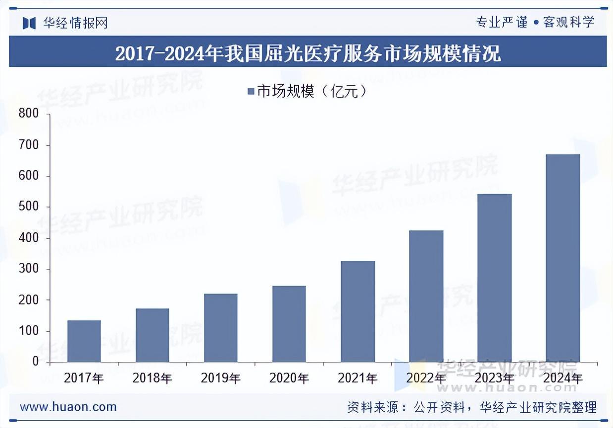 近年来,我国政府高度重视眼健康事业,通过实施一系列政策措施,不断提升近视防控和矫治水平。这一背景下,我国屈光医疗服务市场迎来了快速增长的机遇。我国市场规模将持续扩大,成为全球屈光医疗市场的重要增长极。2024年我国屈光医疗服务市场规模为671.3亿元,同比增长23%。