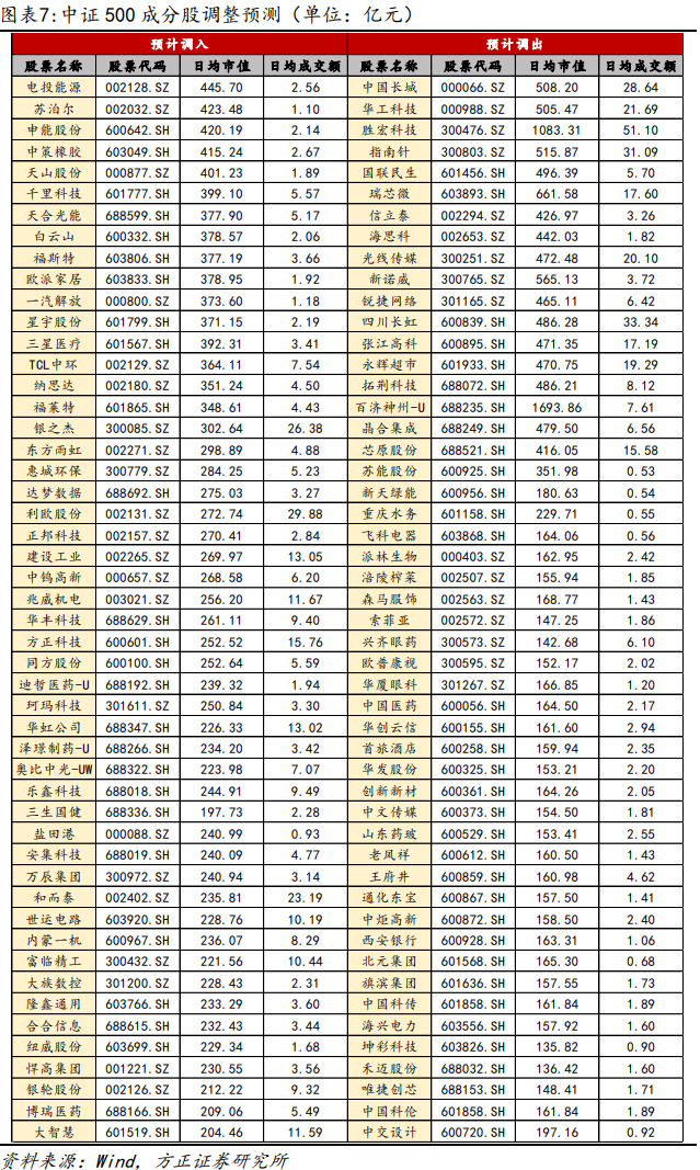 我们预测电投能源、苏泊尔、申能股份等五十只股票将调整进入中证500指数;中国长城、华工科技、胜宏科技等五十只股票将调整出中证500指数。