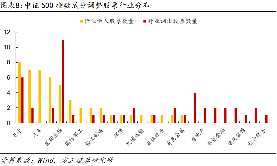 从行业分布的角度来看,预测调入中证500指数的股票主要分布在电子、汽车等行业上。相比之下,预测调出中证500指数的股票主要分布在医药生物、房地产等行业。