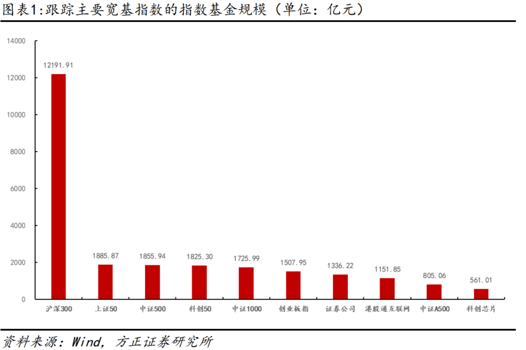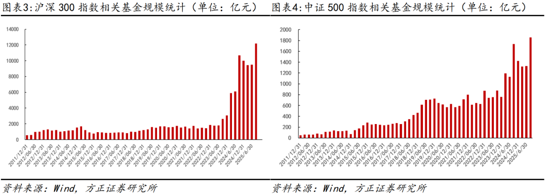 在公募基金整体不断扩容背景下,追踪沪深300、中证500以及科创50指数的基金产品规模也在持续增加,其中被动指数型基金规模的增长更是吸引了投资者的目光。根据2025年三季度的数据,追踪沪深300、中证500和科创50指数的被动指数型基金规模分别超过12191亿元、1885亿元和1855亿元。