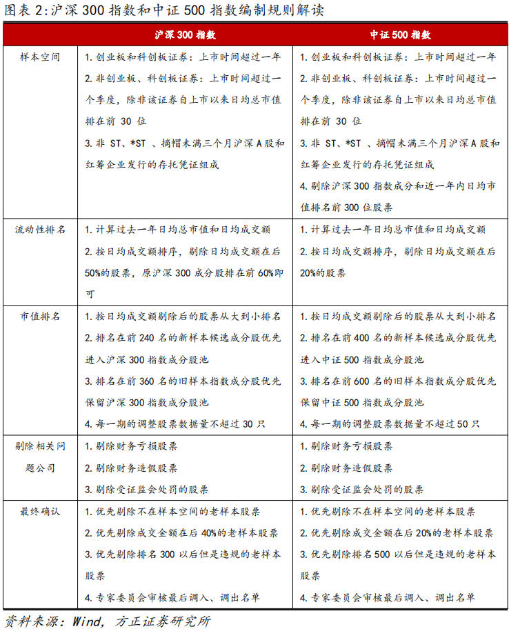 根据中证指数公司最新发布的指数编制方案,我们对沪深300和中证500的指数成分股调整名单进行预测,以探寻相关投资机会。具体的指数编制规则如图表2所示。