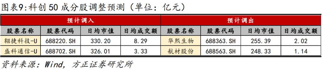 我们预测翱捷科技、盛科通讯将调整进入科创50指数;华熙生物、航材股份将调整出科创50指数。