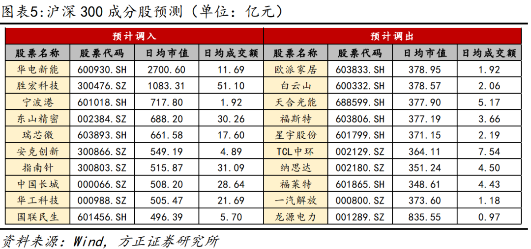 根据如上指数编制方案,我们预测华电新能、胜宏科技等十只股票将调整进入沪深300指数,欧派家居、白云山等十只股票将调整出沪深300指数。