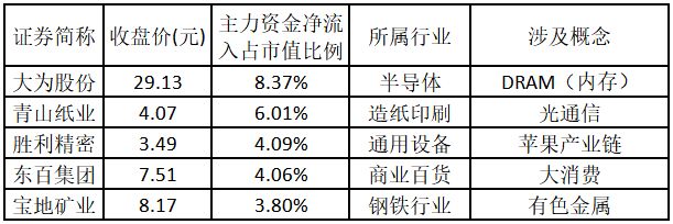 主力资金净流入金额占市值比例排名前5的个股分别为大为股份、青山纸业、胜利精密、东百集团、宝地矿业。