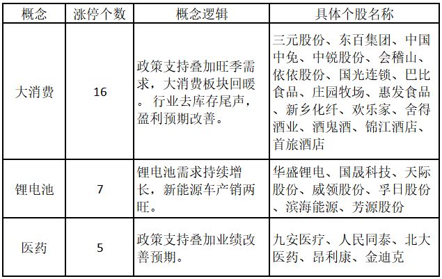 从概念特征来看,今日涨停板个股中,大消费、锂电池、医药概念的个股最多。