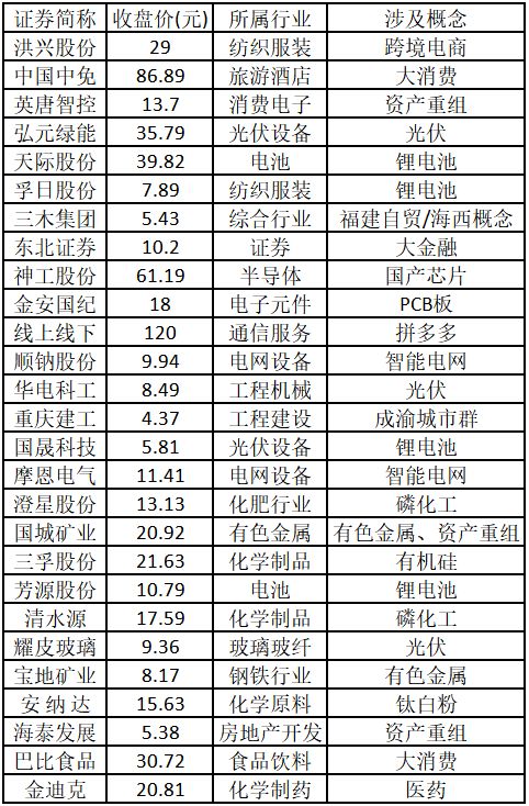 涨停板个股中,股价创出近一年新高的个股有27只(不包括创出历史新高的个股),包括洪兴股份、中国中免、英唐智控、弘元绿能、天际股份、孚日股份、三木集团、东北证券、神工股份、金安国纪、线上线下、顺钠股份、华电科工、重庆建工、国晟科技、摩恩电气、澄星股份、国城矿业、三孚股份、芳源股份、清水源、耀皮玻璃、宝地矿业、安纳达、海泰发展、巴比食品、金迪克,具体如下表所示。