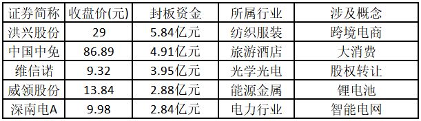 从封板资金来看,今日涨停板个股中,封板资金排名前5的个股包括洪兴股份、中国中免、维信诺、威领股份、深南电A。欢迎大家关注微信公众号“道达号”,其“道达涨停复盘”栏目为大家解读。