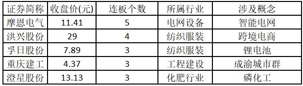 从连板情况来看,今日首板个股有60只;2连板的个股有5只;3连板及以上的个股有6只。今日连板数排名前5的个股包括摩恩电气、洪兴股份、孚日股份、重庆建工、澄星股份,具体如下表所示。