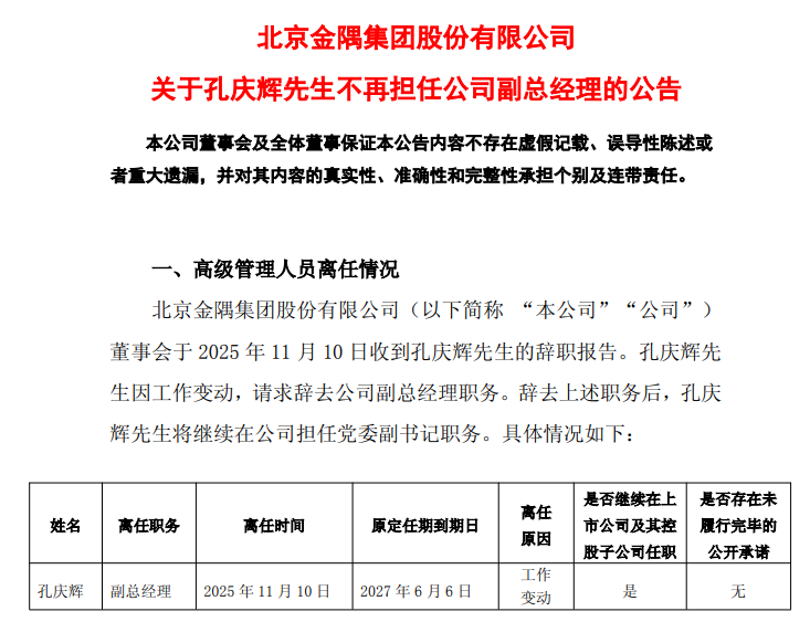 11月10日,北京金隅集团股份有限公司发布公告,董事会于2025年11月10日收到孔庆辉先生的辞职报告。孔庆辉先生因工作变动,请求辞去公司副总经理职务。辞去上述职务后,孔庆辉先生将继续在公司担任党委副书记职务。