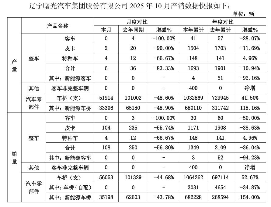 11月10日,曙光股份(600303)发布公告,2025年10月的产销数据快报显示,整车产量为6辆,同比减少83.33%。前10个月累计产量为1693辆,同比下降10.94%。