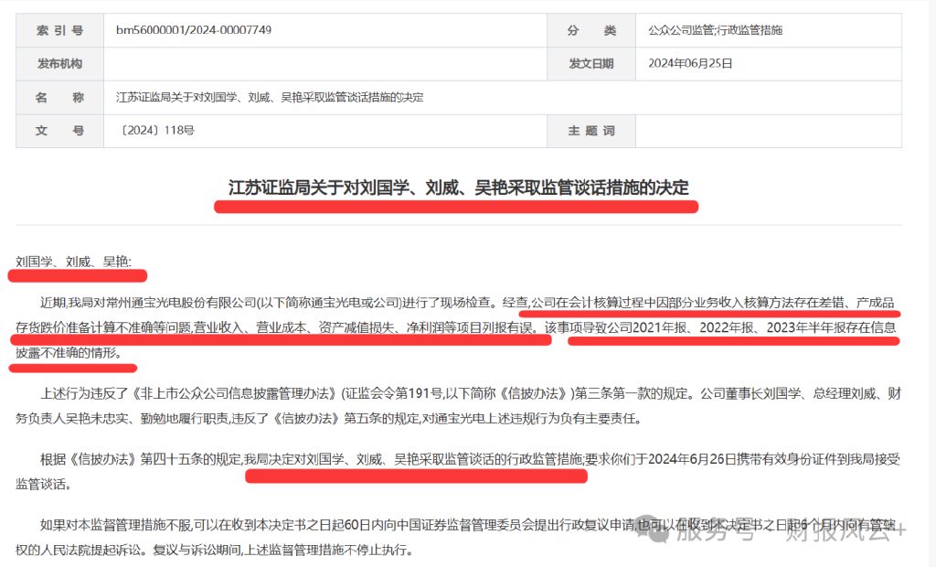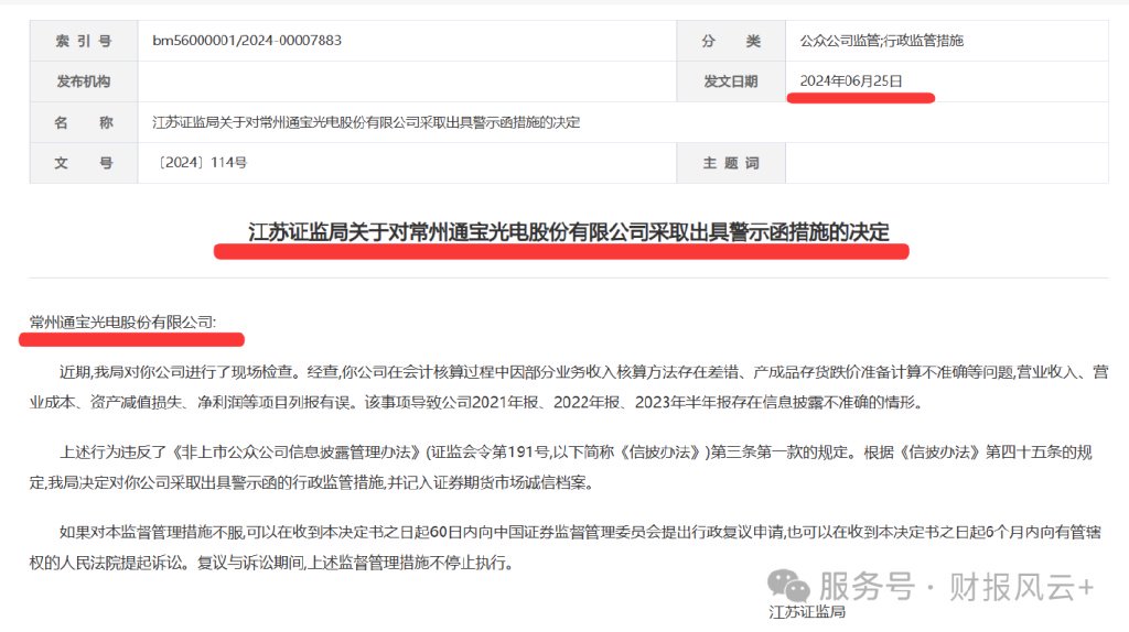 通宝光电的财务数据背后隐藏着诸多隐患。2024年6月,公司因会计差错导致多期财报信披不准确,被江苏证监局采取出具警示函的行政监管措施。