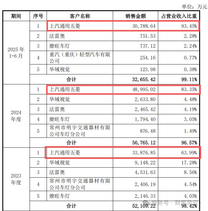 通宝光电的招股书揭示了一个令人咋舌的数据:2025年1-6月,公司对前五大客户的销售收入占比高达99.11%,其中对第一大客户上汽通用五菱的依赖程度达到惊人的93.45%。