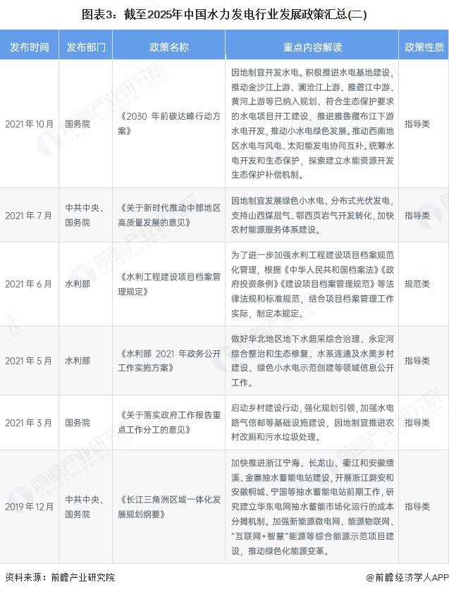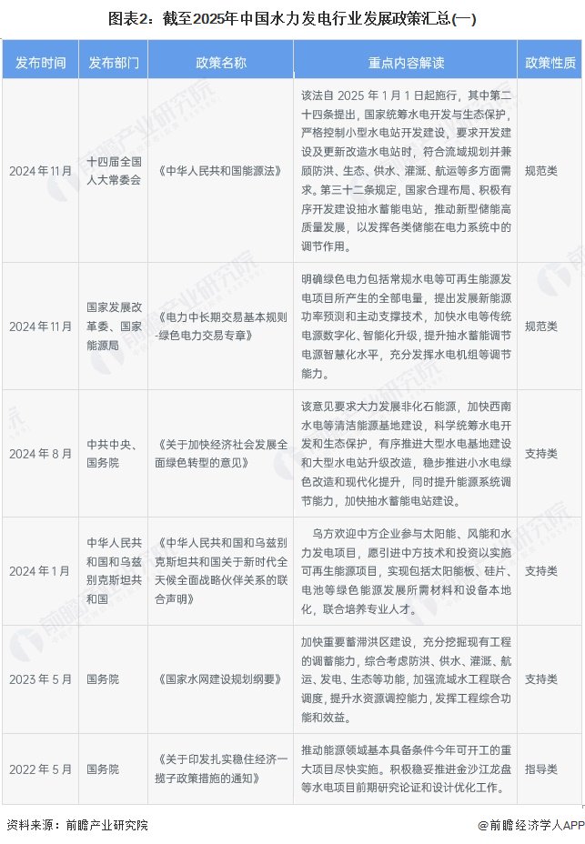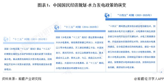 1910年中国第一座水力发电站——石龙坝水电站开始建设,拉开了中国水电建设的帷幕。之后中国水电行业经过不断学习和探索,逐渐掌握了自主设计和建设的能力。随着我国进入改革开放和社会主义现代化建设新时期,国家开始逐步探索水电行业投资体制和建设体制改革,逐渐解决建设资金和市场定价的问题。同时,“十二五”和“十三五”期间国家方案规划的制订不断完善水力发电的布局,推动水力发电技术的发展。为满足电力系统日益增长的调峰需要,抽水蓄能电站也在快速发展。在“十四五”规划中,再次明确强调了可再生新能源的重要性,要求加快水电站的布局,推动能源清洁化,同时还强调了要大力发展水力发电创新技术,建立清洁能源基地,完善小水电退出机制,开展抽水蓄能建设,加快绿色水电发展。
