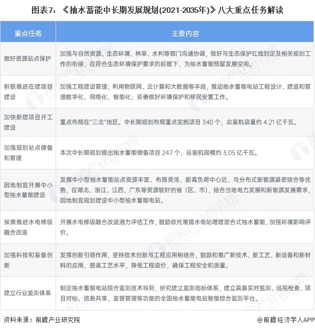 《中华人民共和国国民经济和社会发展第十四个五年规划和2035年远景目标纲要》中提出加快抽水蓄能电站建设和新型储能技术规模化应用。2021年9月,国家能源局发布《抽水蓄能中长期发展规划(2021-2035年)》,提出了八大重点任务,具体内容如下:
