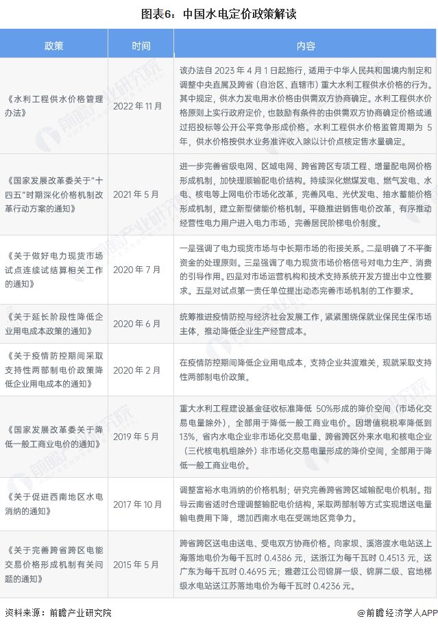 2013年5月6日,国务院总理李克强在主持召开国务院常务会议上,要求年内出台完善水电上网价格形成机制改革方案。2013年初,发改委在小范围内对水电定价机制的改革征求了意见,2014年1月11日,发改委发布《关于完善水电上网电价形成机制的通知》,明确不同情境下水电价格形成与确定的机制。2017年10月,针对西南地区尤其是四川、云南弃水问题,实现水电资源的充分利用和优化配置,发布《促进西南地区水电消纳的通知》,在其中提出完善价格机制,提高水电竞争力。2019年,发改委进一步要求降低一般工商业电价。