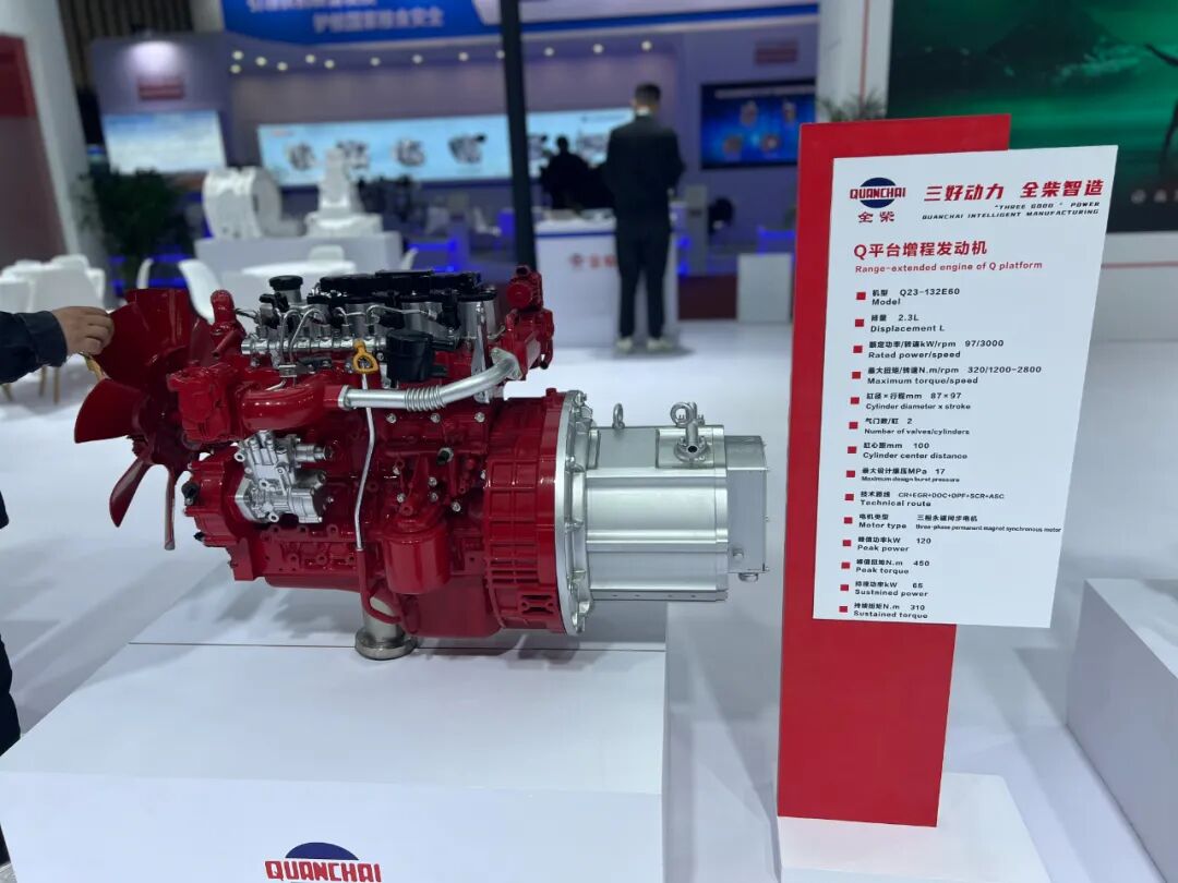 此外,Q平台还展出了一款增程发动机,排量2.3L,搭载CR+EGR+DOC+DPF+SCR+ASC技术,配永磁同步电机,峰值功率120kw,峰值扭矩450牛米,动力强,续航长,适合新能源轻卡产品。