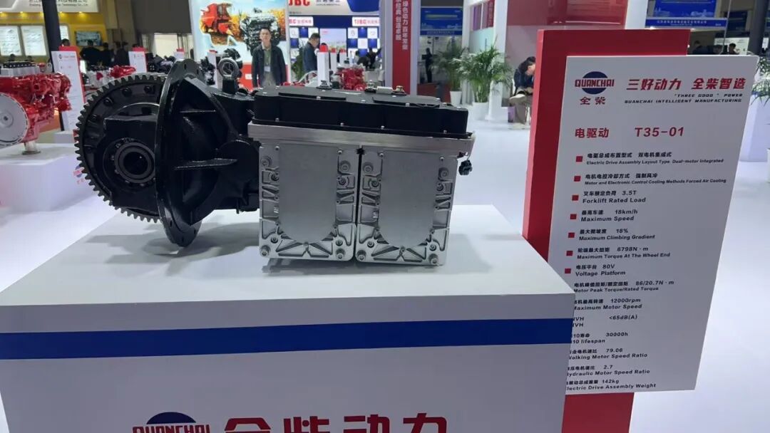 在新能源电驱总成领域,全柴展出了T35-01双电机集成式电驱总成产品,最大爬坡度达到18%,适配叉车产品。