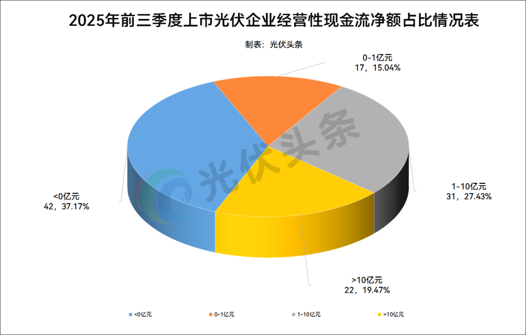 经营性现金流净额是企业盈利能力的重要指标,也是企业造血能力的体现。前三季度113家上市光伏企业披露经营性现金流净额数据,42家企业经营性现金流净额为负值,占比达到37.17%。