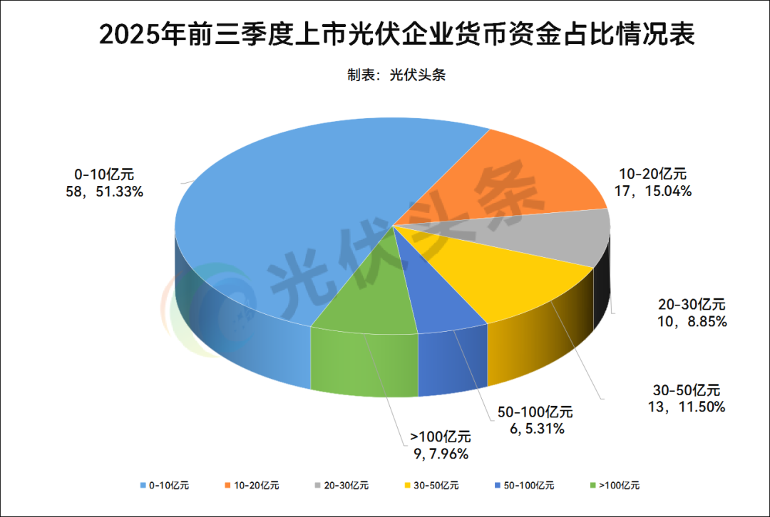 光伏头条统计,113家披露货币资金的上市光伏企业之中,58家企业货币资金在1-10亿元之间,占比为51.33%。50亿元及以上的企业为15家,占比13.27%。