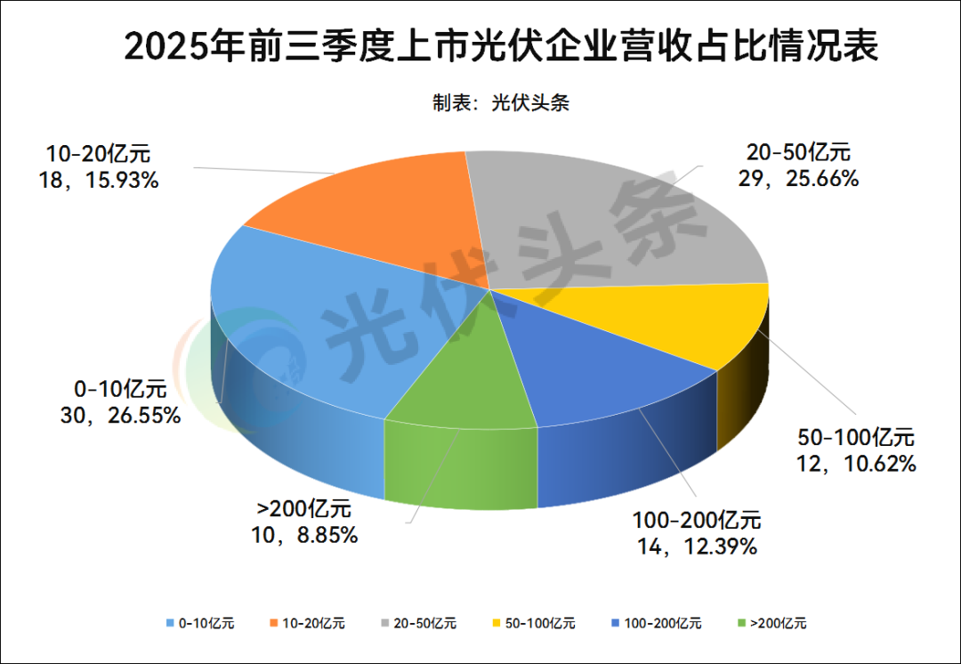 营收数据代表企业的经营规模,也是企业产品或服务社会价值的体现。光伏头条统计,前三季度113家上市光伏企业之中,67家企业营收同比下滑59.29%。具体而言,营收在10亿元以下,占比达到26.55%;营收在10-100亿元之间的企业59家,占比52.21%;24家企业营收超100亿元。