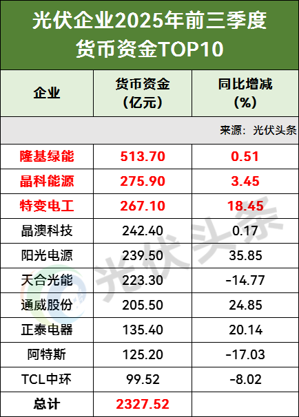 隆基绿能、晶科能源、特变电工领衔货币资金榜