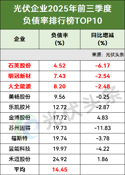 负债率展现一个企业负债经营情况,也是企业经营能力的体现。三季度,负债率排名前十的企业依次为石英股份、明冠新材、大全能源、美畅股份、乐凯胶片、金博股份、苏州固锝、福斯特、昱能科技、禾迈股份。这十家企业平均负债率为14.45%。