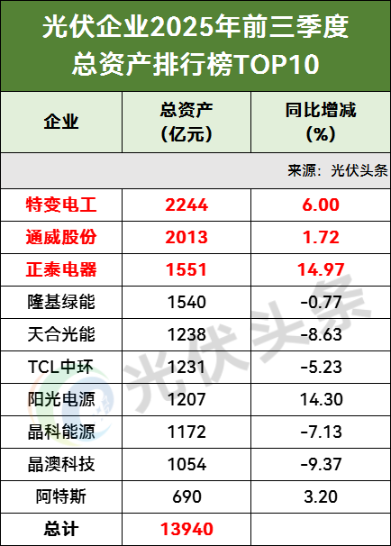 总资产是一个企业综合实力的直接体现。截至2025年三季度,113家企业总资产合计25986.05亿元,排名前十的企业依次为特变电工、通威股份、正泰电器、隆基绿能、天合光能、TCL中环、阳光电源、晶科能源、晶澳科技、阿特斯。这十家企业合计总资产13940亿元,占比为53.64%。