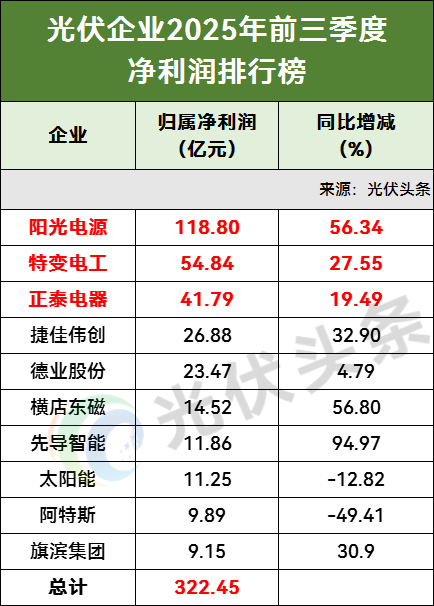 阳光电源、特变电工、正泰电器领衔归属净利润榜