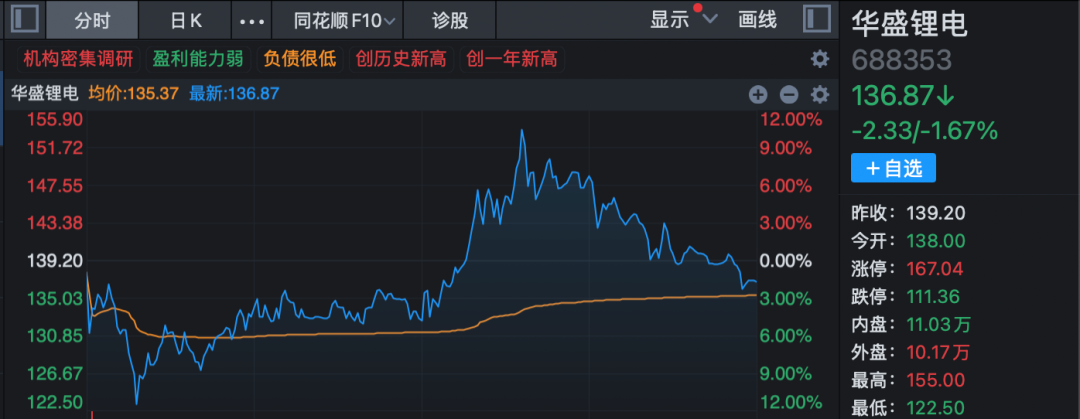 除锂矿和锂电外,另一锂电材料电解液同样冲高。17日午后,锂电池电解液概念震荡回升。早盘一度跌逾10%的华盛锂电(688353)盘中一度反弹涨超10%,续创历史新高。永太科技走出7天4板;科隆股份、清水源(维权)、海科新源、石大胜华、新宙邦涨幅靠前。