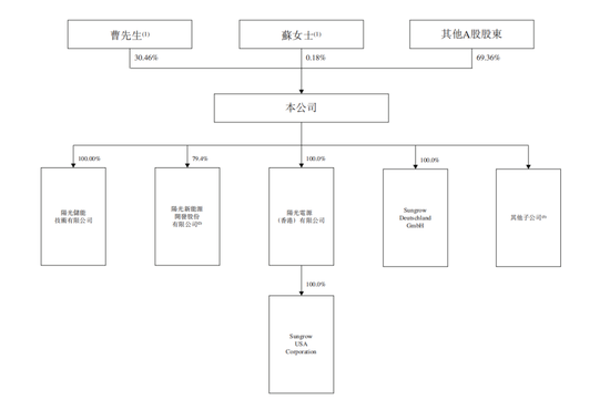 递表前,曹仁贤直接持有阳光电源30.46%股份;其妻子苏蕾持股0.18%,是曹仁贤的一致行动人,二人合计控制公司30.63%股权。