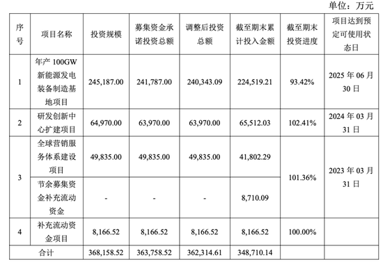 截至2025年6月末,募集资金用于“年产100GW新能源发电装备制造基地项目” 、“全球营销服务体系建设项目”的总投资额分别为22.45亿元、4.18亿元,分别节余2.51亿元和8710.09万元,合计3.38亿元,将永久补充流动资金,用于公司日常生产经营活动。