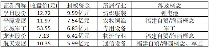 从封板资金来看,今日涨停板个股中,封板资金排名前5的个股包括孚日股份、平潭发展、长城军工、龙洲股份、航天发展。