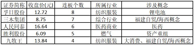 从连板情况来看,今日首板个股有56只;2连板的个股有12只;3连板及以上的个股有11只。今日连板数排名前5的个股包括孚日股份、三木集团、人民同泰、胜利股份、九牧王,具体如下表所示。