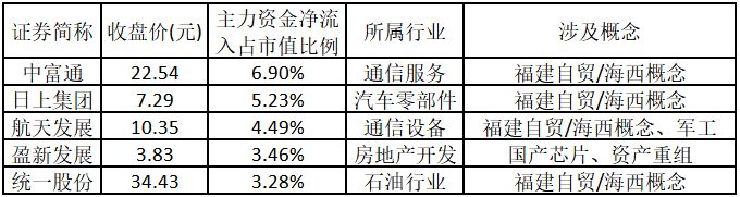 主力资金净流入金额占市值比例排名前5的个股分别为中富通、日上集团、航天发展、盈新发展、统一股份。
