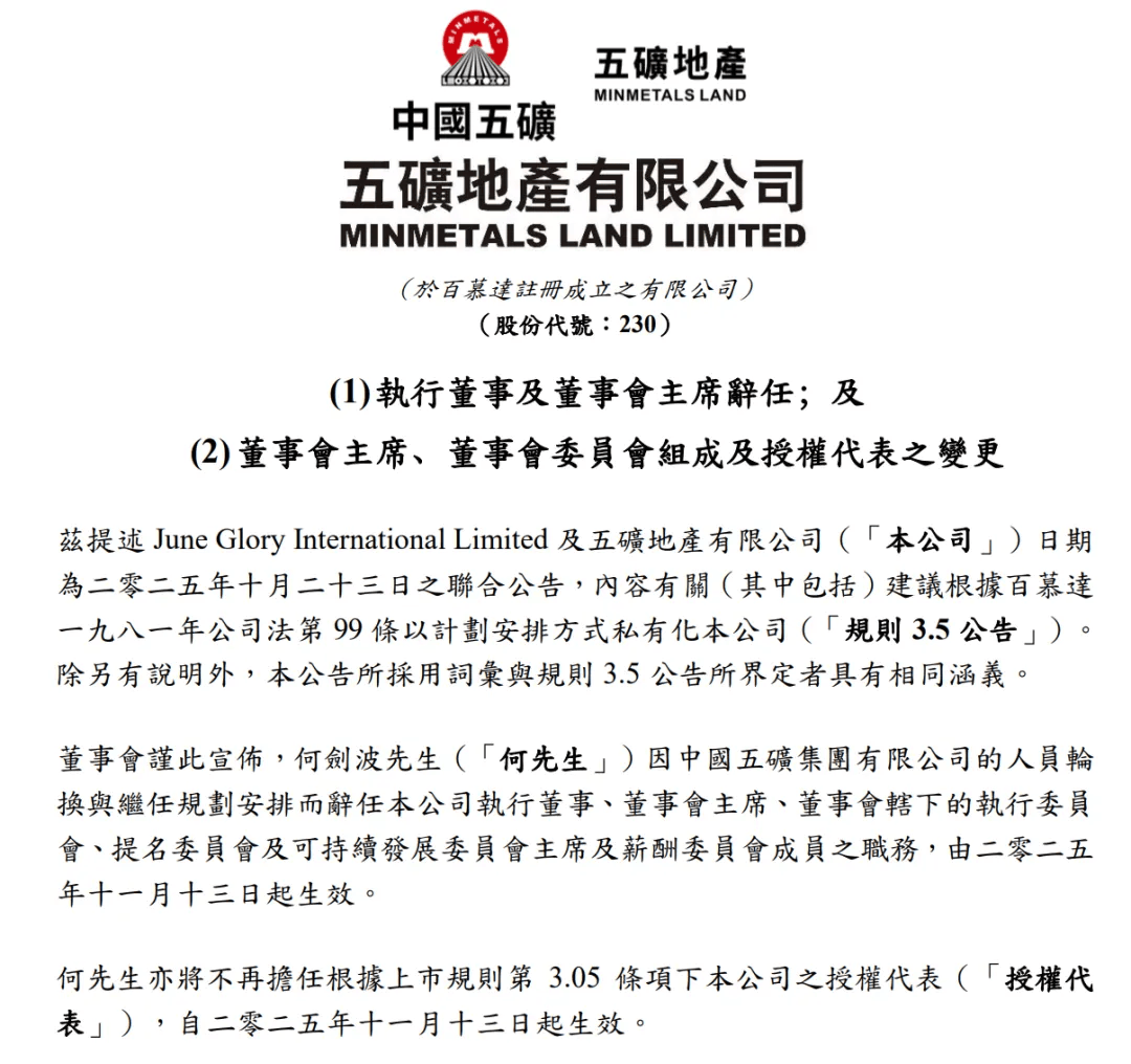 11月14日,招商局置地宣布,蒋铁峰辞去非执行董事、董事会主席及提名委员会主席的职务,由朱文凯接任。就在前一日(11月13日),五矿地产也公告称,何剑波辞去执行董事、董事会主席等职务,并不再担任授权代表,戴鹏宇被任命为董事会代理主席。