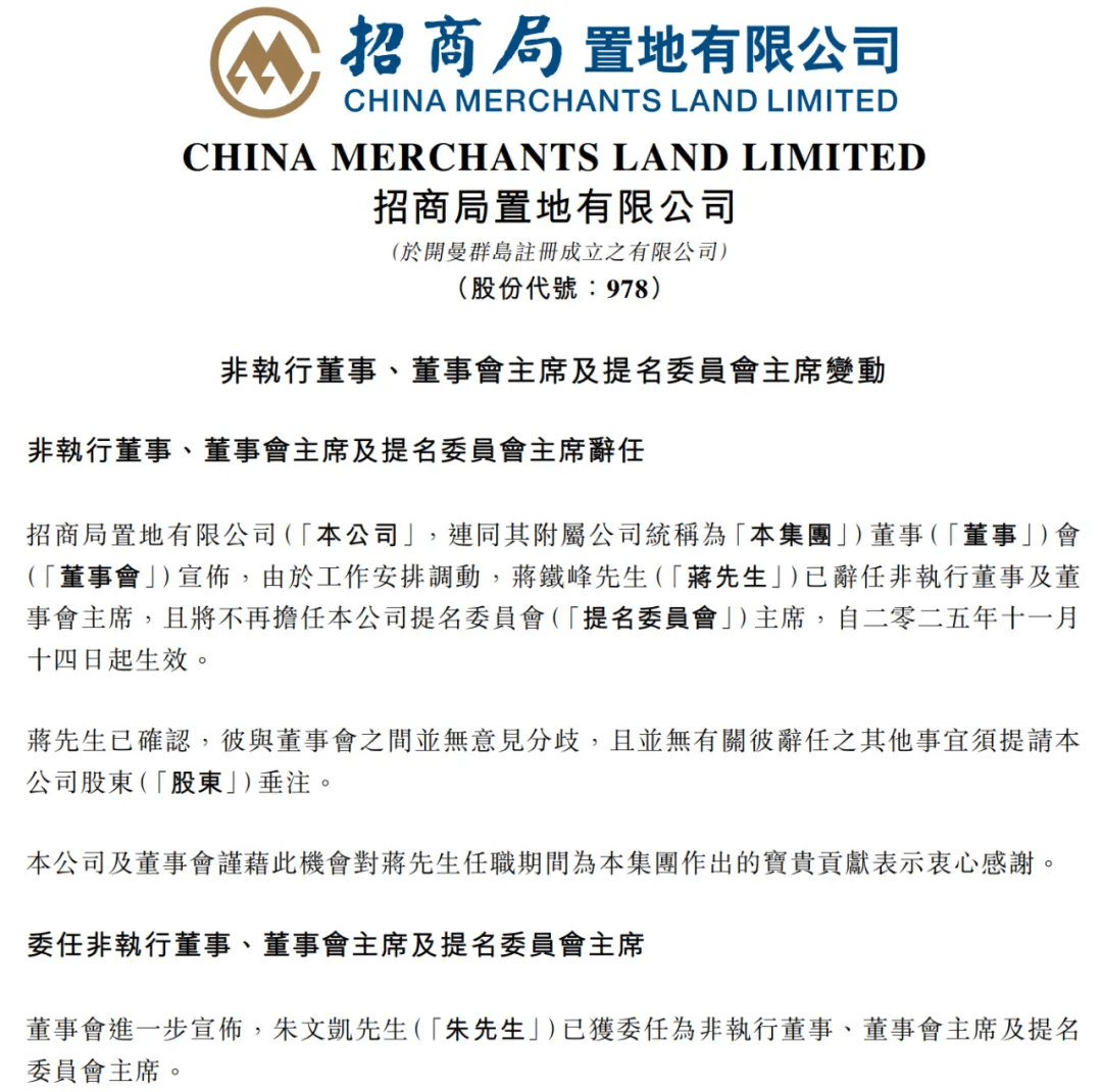 11月14日,招商局置地宣布,蒋铁峰因工作安排调动,辞去非执行董事、董事会主席及提名委员会主席的职务;与此同时,朱文凯被委任为新的非执行董事、董事会主席及提名委员会主席,该变动自当日起生效。