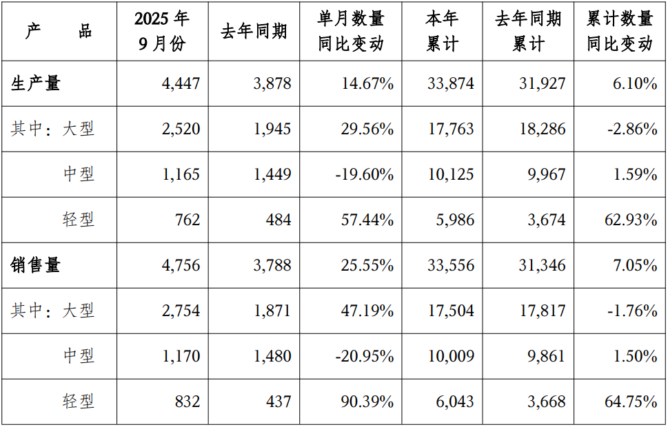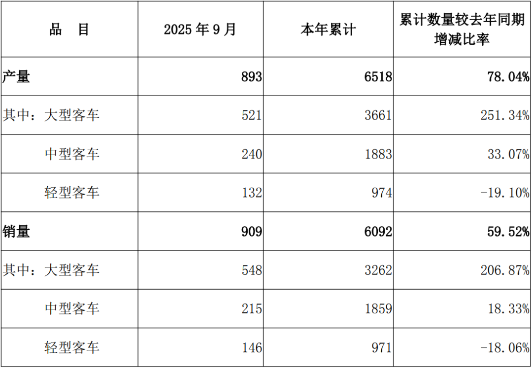 2025年1-9月,宇通客车共生产各类客车33874辆,同比增长6.10%,实现销售33556辆,同比增长7.05%。(参考9月份产销快报)