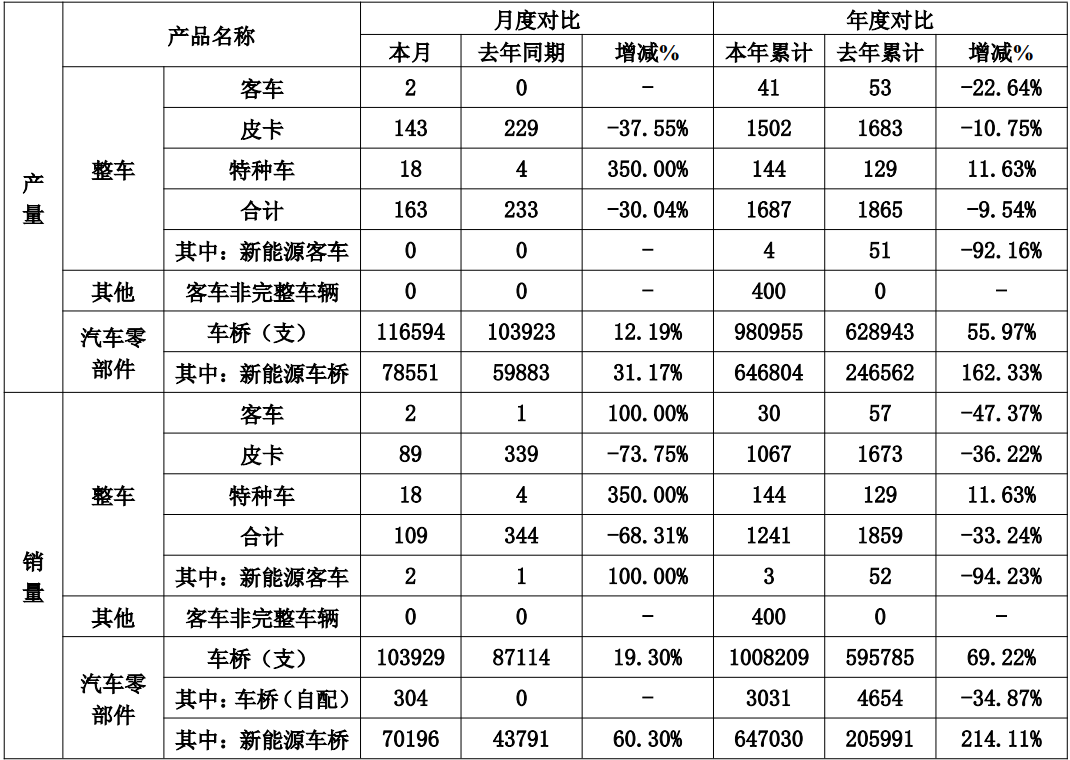 2025年1-9月,东风汽车共生产各类客车2990辆,同比下滑62.18%,实现销售3688辆,同比下滑59.90%。生产客车底盘1926辆,同比下滑4.89%,实现销售2005辆,同比增长0.40%。(参考9月份产销快报)