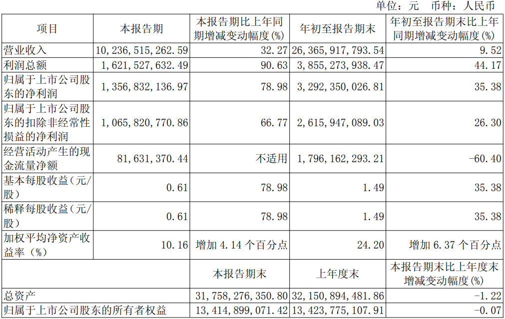 2025年三季度,宇通客车实现营业收入102.36亿元,同比增长32.27%。归属于上市公司股东的净利润13.57亿元,同比增长78.98%。扣除非经常性损益的净利润10.66亿元,同比增长66.77%。前三季度累计营业收入263.66亿元,同比增长9.52%。归属于上市公司股东的净利润32.92亿元,同比增长35.38%。扣除非经常性损益的净利润26.16亿元,同比增长26.30%。截至2025年9月底,公司总资产达到317.58亿元,与2024年末相比下滑1.22%。财务指标方面,2025年前三季度基本每股收益1.49元,同比增长35.38%。