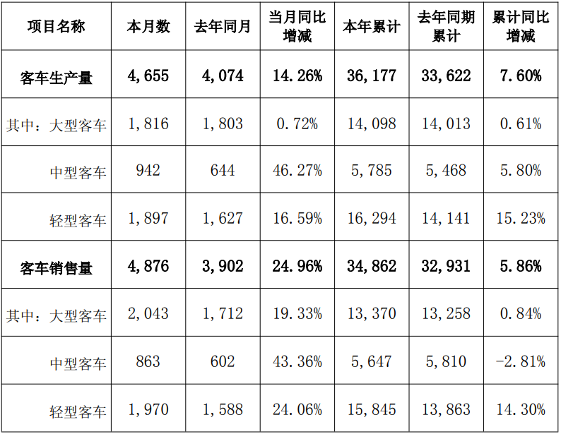 2025年1-9月,金龙集团共生产各类客车36177辆,同比增长7.60%,实现销售34862辆,同比增长5.86%。(参考9月份产销快报)