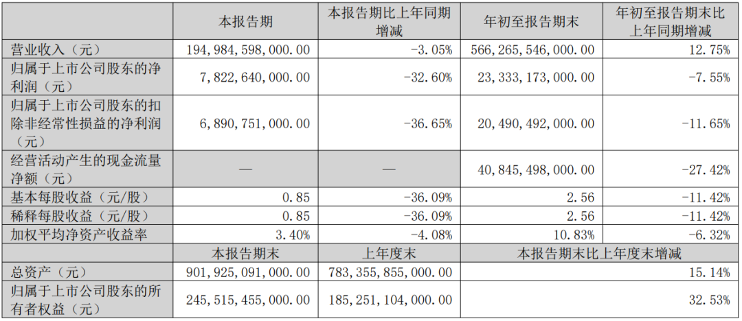 2025年三季度,比亚迪实现营业收入1949.85亿元,同比下滑3.05%。归属于上市公司股东的净利润78.23亿元,同比下滑32.60%。扣除非经常性损益的净利润68.91亿元,同比下滑36.65%。前三季度累计营业收入5662.66亿元,同比增长12.75%。归属上市公司股东的净利润233.33亿元,同比下滑7.55%。扣除非经常性损益的净利润204.90亿元,同比下滑11.65%。截至2025年9月底,公司总资产达到9019.25亿元,与2024年末相比增长15.14%。财务指标方面,2025年前三季度基本每股收益2.56元,同比下滑11.42%。