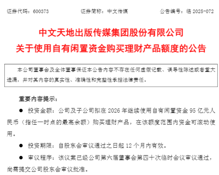 【大河财立方消息】11月18日,中文天地出版传媒集团股份有限公司(证券简称:中文传媒)发布公告称,董事会临时会议审议通过相关议案,公司及子公司拟在2026年继续使用自有闲置资金不超过95亿元(指任一时点的最高余额)购买理财产品。