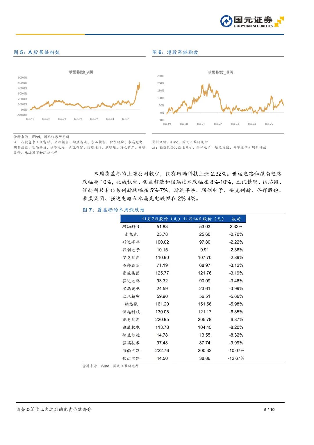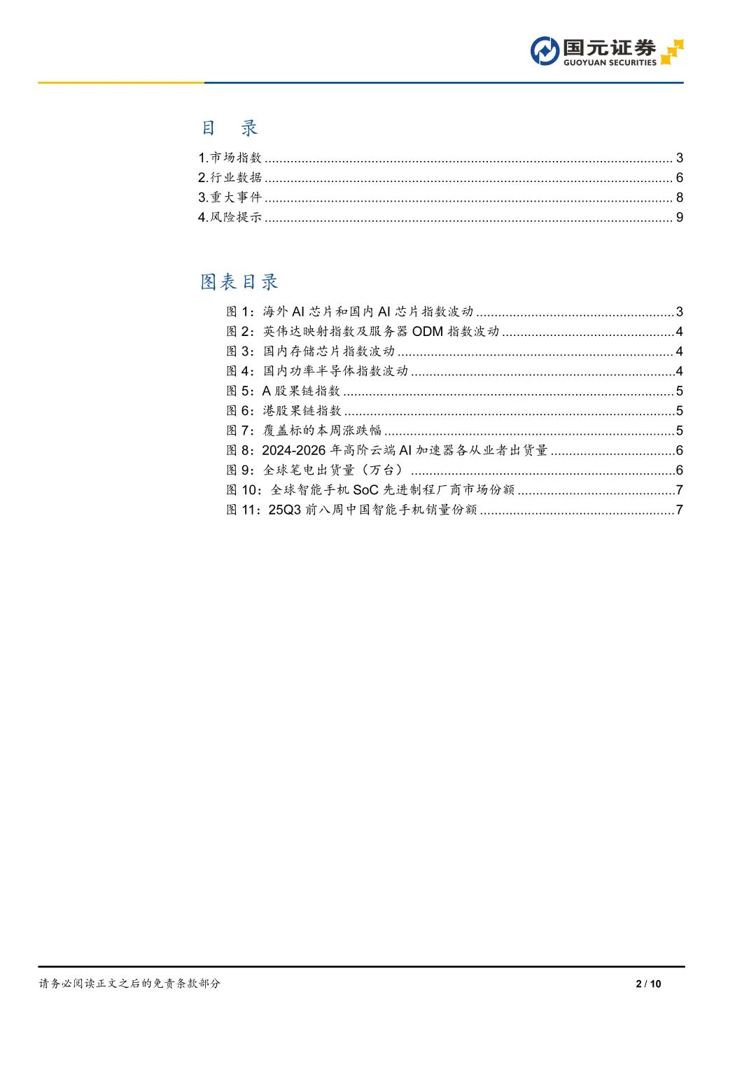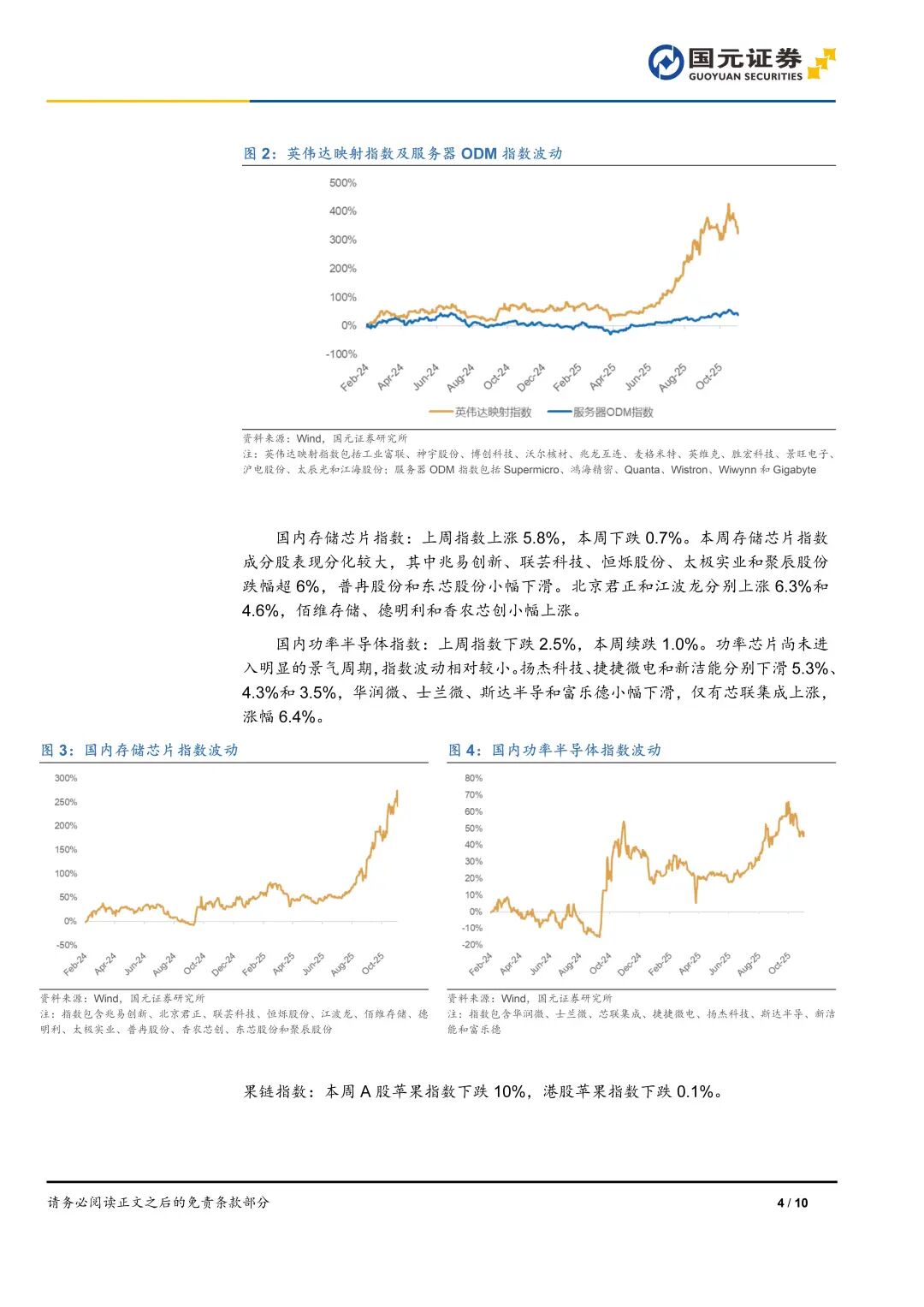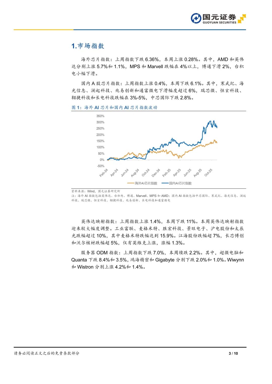 1)海外AI芯片指数本周上涨0.3%,AMD和英伟达分别上涨5.7%和1.1%,MPS和Marvell跌幅在4%以上,博通下滑2%,台积电小幅下滑。2)国内AI芯片指数本周下跌6.1%。寒武纪、海光信息、澜起科技、兆易创新和通富微电下滑幅度超过6%,瑞芯微、恒玄科技、翱捷科技和长电科技跌幅在3%-5%,中芯国际下跌2.8%。3)英伟达映射指数本周下跌11%,工业富联、麦格米特、胜宏科技、景旺电子、沪电股份和太辰光跌幅超过10%,其中麦格米特跌幅达到15.9%。江海股份跌幅超7%,长芯博创和沃尔核材跌幅超5%,仅有英维克上涨,涨幅1.3%。4)服务器ODM指数本周下跌2.2%,超微电脑和Quanta下跌8.4%和3.5%,鸿海精密和Gigabyte分别下跌2.0%和1.0%。Wiwynn和Wistron分别上涨4.2%和1.4%。5)存储芯片指数本周下跌0.7%,兆易创新、联芸科技、恒烁股份、太极实业和聚辰股份跌幅超6%,北京君正和江波龙分别上涨6.3%和4.6%。6)功率半导体指数本周下跌1.0%;国元A股果链指数下跌10%,国元港股果链指数下跌0.1%。