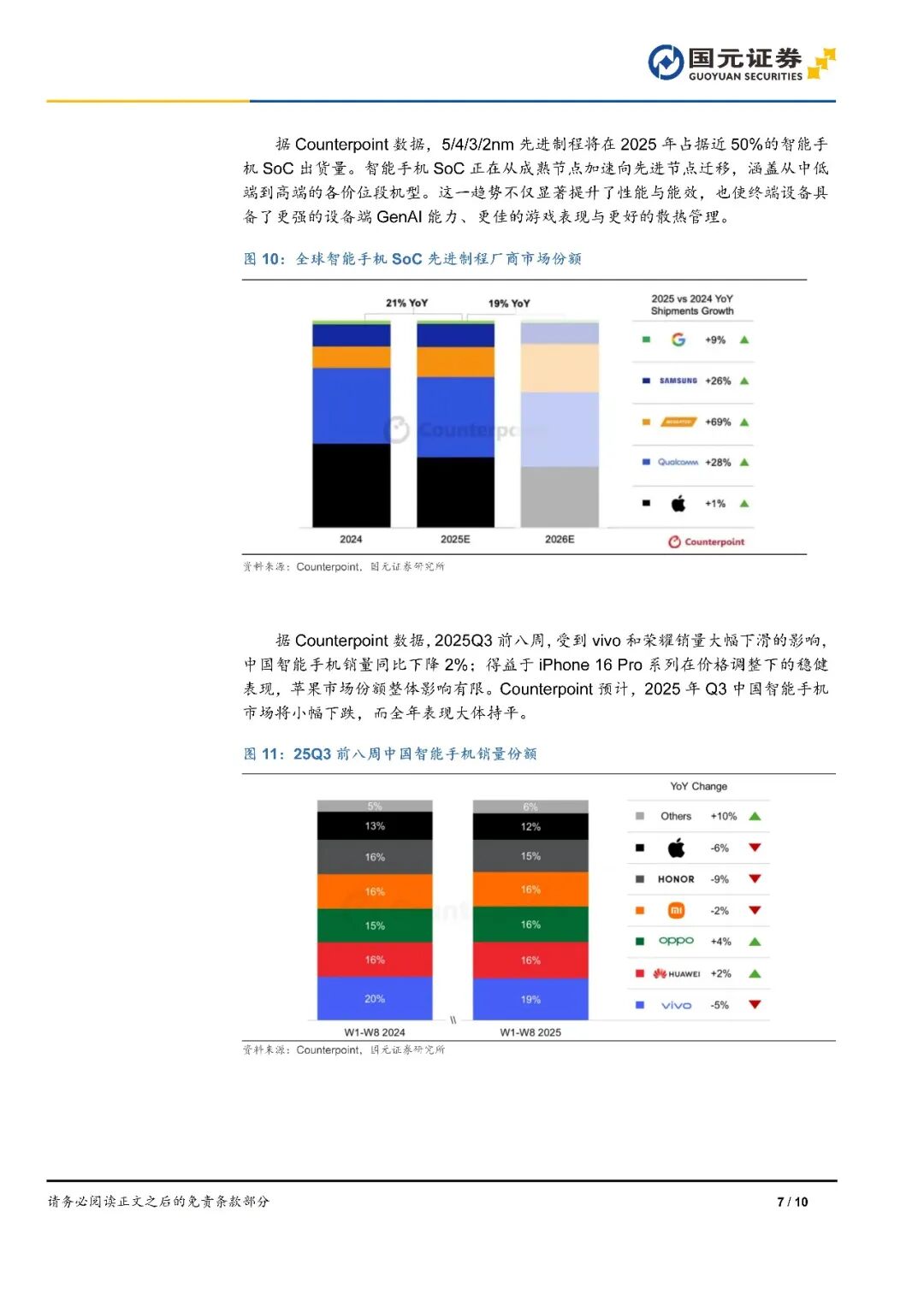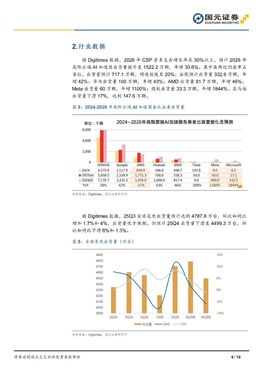 1)据Digitimes数据,2026年CSP资本支出增长率在30%以上,预计2026年高阶云端AI加速器出货量提升至1522.2万颗,年增30.6%。2)据Digitimes数据,25Q3全球笔电出货量预计达到4787.8万台,环比和同比增加1.7%和4%,但预计25Q4出货量下滑至4499.3万台,环比和同比下滑6%和1.3%。3)据Counterpoint数据,5/4/3/2nm先进制程将在2025年占据近50%的智能手机SoC出货量。