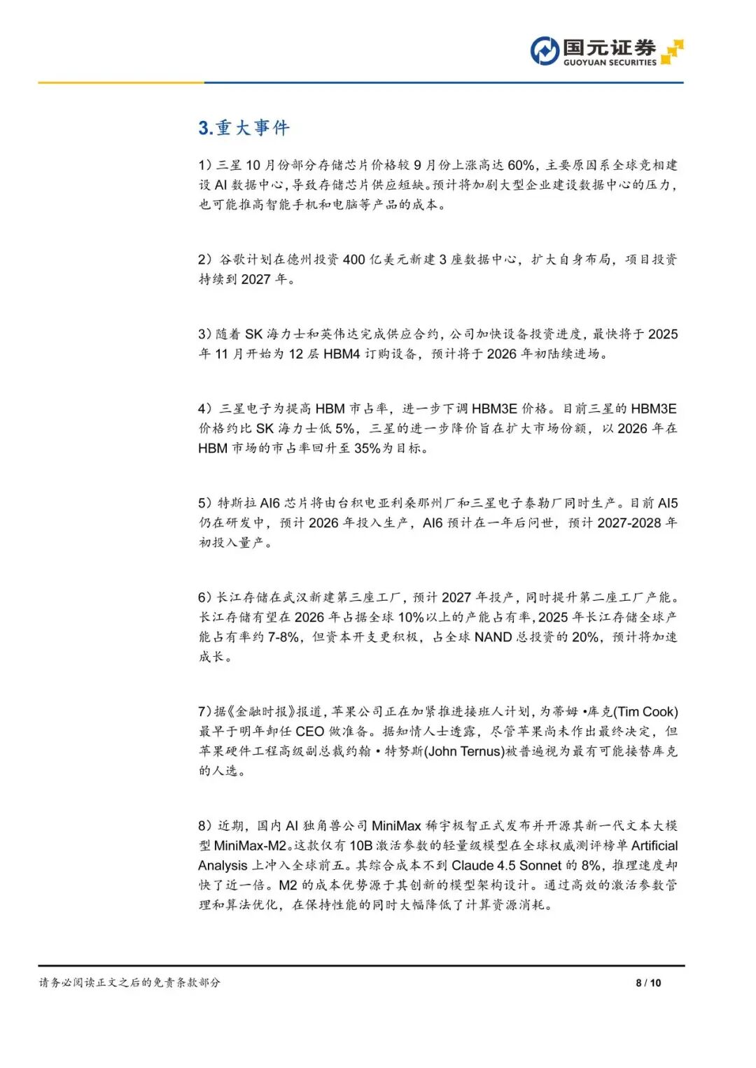 1)三星10月份部分存储芯片价格较9月份上涨高达60%。2)谷歌计划在德州投资400亿美元新建3座数据中心,扩大自身布局,项目投资持续到2027年。3)随着SK海力士和英伟达完成供应合约,公司加快设备投资进度,最快将于2025年11月开始为12层HBM4订购设备,预计将于2026年初陆续进场。4)三星电子为提高HBM市占率,进一步下调HBM3E价格。5)长江存储在武汉新建第三座工厂,预计2027年投产,同时提升第二座工厂产能。