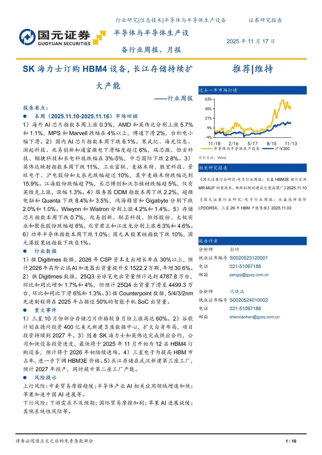 本报告摘自国元证券2025年11月17日已发布的《SK海力士订购HBM4设备,长江存储持续扩大产能——电子行业周报》,具体报告及分析内容请详见报告。若因对报告的摘编等产生歧义,应以报告发布当日的完整内容为准。