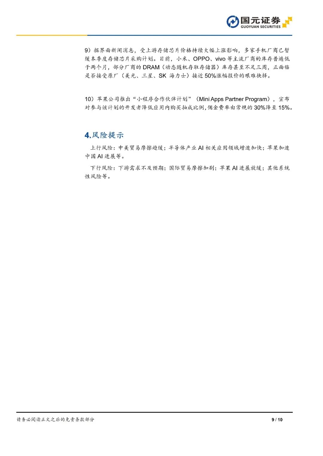 上行风险:中美贸易摩擦趋缓;半导体产业AI相关应用领域增速加快;苹果加速中国AI进展等。