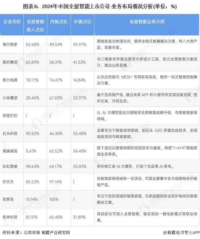 从全屋智能行业上市公司境内外业务布局对比来看,多家企业在全屋智能领域各有布局,业务方向呈现差异化特征。海尔智家提供全栈式智慧解决方案,场景与产品体系丰富;美的集团通过合作设计工具推动方案落地;格力电器以特定架构实现一站式智能控制。小米集团依托生态链打造高性价比开放生态,阿里则以AI大模型升级全屋智能战略。石头科技聚焦智能清洁领域深耕技术,海康威视旗下萤石凭借视频技术构建生态体系。长虹美菱基于AI大模型布局全品类智能家电,好太太侧重晾晒相关智能产品,安居宝专注家庭安防解决方案,极米科技以投影仪为核心实现全屋智能场景联动。各企业根据自身优势,在细分领域或整体生态构建上持续发力,形成多元竞争格局。