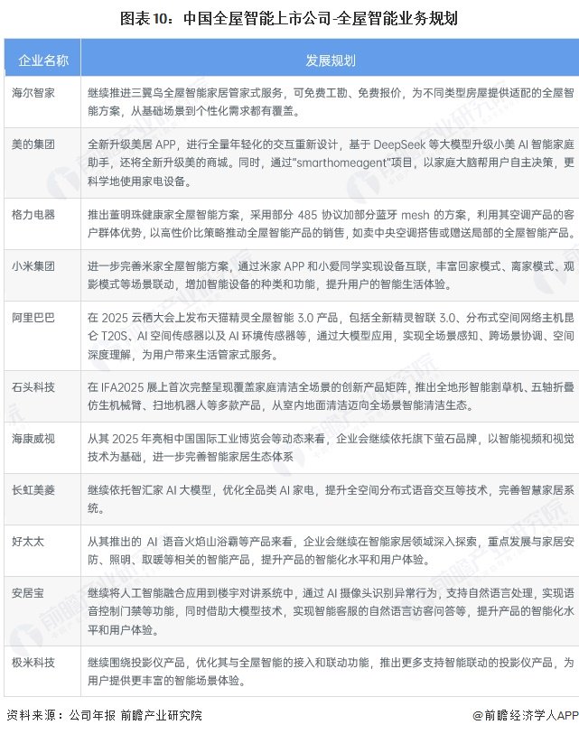 2025年,多家企业围绕全屋智能业务制定了差异化发展规划:海尔智家推进三翼鸟管家式服务,覆盖多元场景需求;美的集团升级美居APP与AI助手,通过“家庭大脑”优化用户决策体验;格力电器推出专属全屋智能方案,依托空调客户群体推行高性价比策略。小米集团持续完善米家生态的设备互联与场景联动;阿里巴巴发布天猫精灵全屋智能3.0产品,借助大模型实现全场景智能服务。石头科技聚焦全场景智能清洁,推出多品类创新产品;海康威视依托萤石品牌深化智能视频生态布局。长虹美菱优化AI家电与语音交互技术;好太太深耕家居安防、照明等细分智能产品;安居宝将AI融入楼宇对讲系统,提升门禁与客服智能化水平;极米科技则聚焦投影仪的全屋智能接入与联动功能升级,各企业均立足自身优势推动全屋智能领域的创新与拓展。