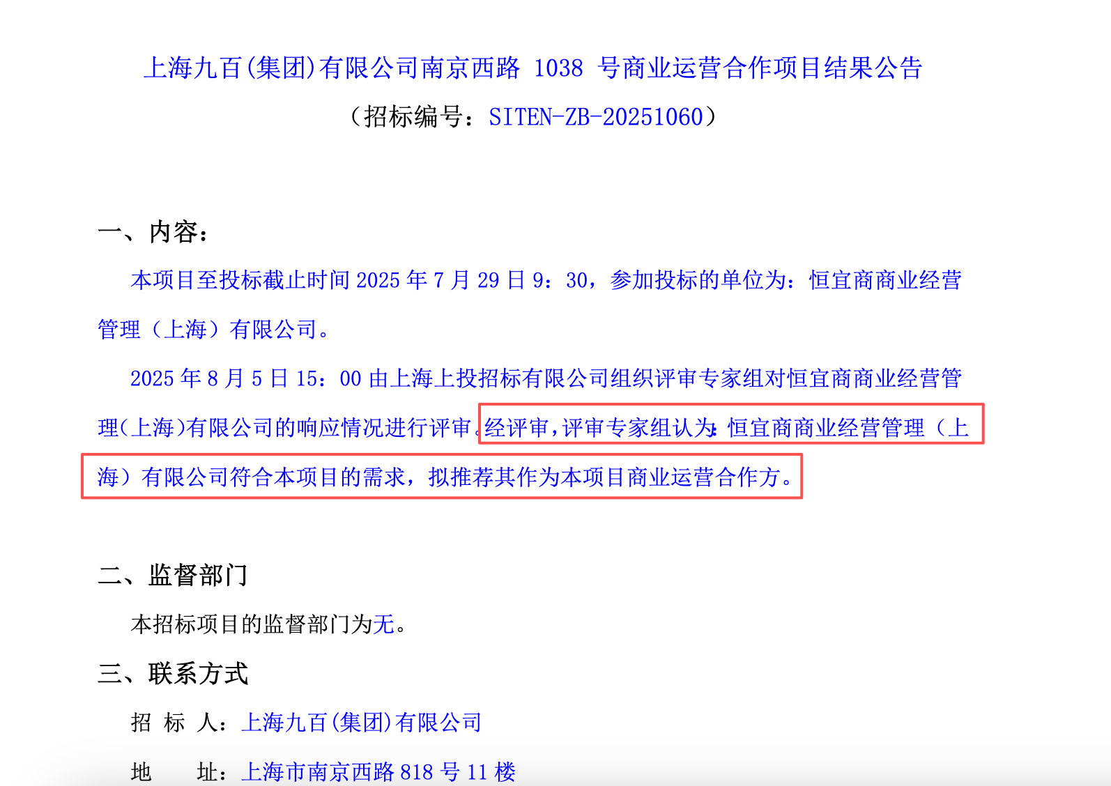 在成立合资公司后,投标人应投入不低于5亿元资金作为项目酒店、商场及办公区域的装修费用,招标人上海九百也将根据最终确定的持股比例对应投入资金。此外,合资公司对项目的商业运营及物业管理履行期限为20年。